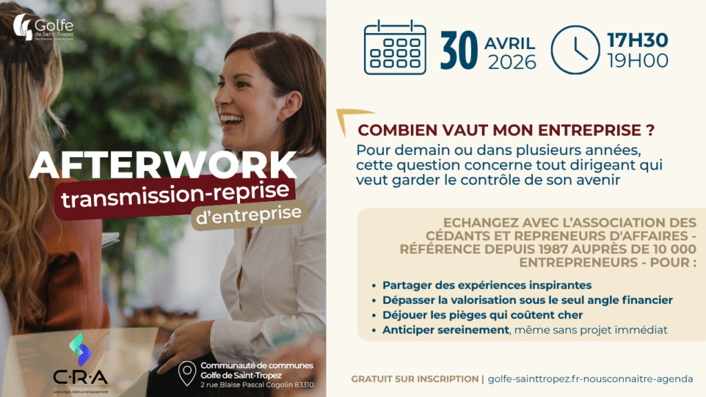 Dans ce cadre, la Communauté de communes Golfe de Saint-Tropez propose un temps d’échange avec un intervenant du C.R.A et un expert de l’évaluation. Cet afterwork transmission-reprise vise à vous apporter des éclairages concrets sur les méthodes d’évaluation et les points de vigilance.
