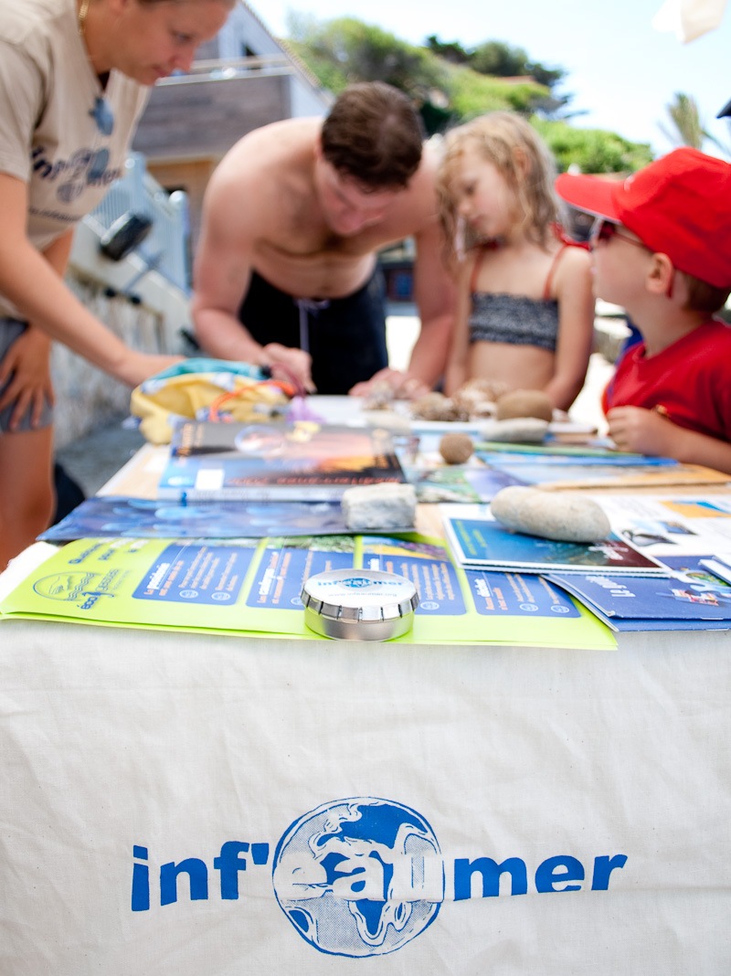 Dans cette perspective de transmission d’information afin d’éveiller les publics estivants et résidents aux enjeux environnementaux locaux, le service relaie des dispositifs d’initiatives régionales ou nationales (accompagnement de classes dans la création d’Aire Marines Educatives, campagnes régionales de sensibilisation des usagers Ecogestes ou Inf’Eau Mer, etc.) . Il développe aussi des actions d’initiative locales (projets pédagogiques avec les classes du territoire, animation de conférences et de diaporamas interactifs, création et animation de sentiers marins). Il réalise en outre des campagnes multimédias (applications mobiles) et édite des documents d’information sur l’environnement marin local (panneaux sur les plages, plaquettes pédagogiques, etc.)